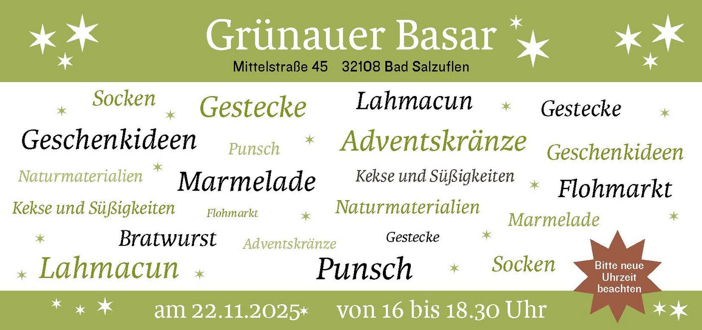 Herzliche Einladung zum Grünauer Basar am Samstag, den 22. November 2025 in der Zeit von 16 bis 18.30 Uhr auf dem Gelände der Jugendhilfe Grünau.